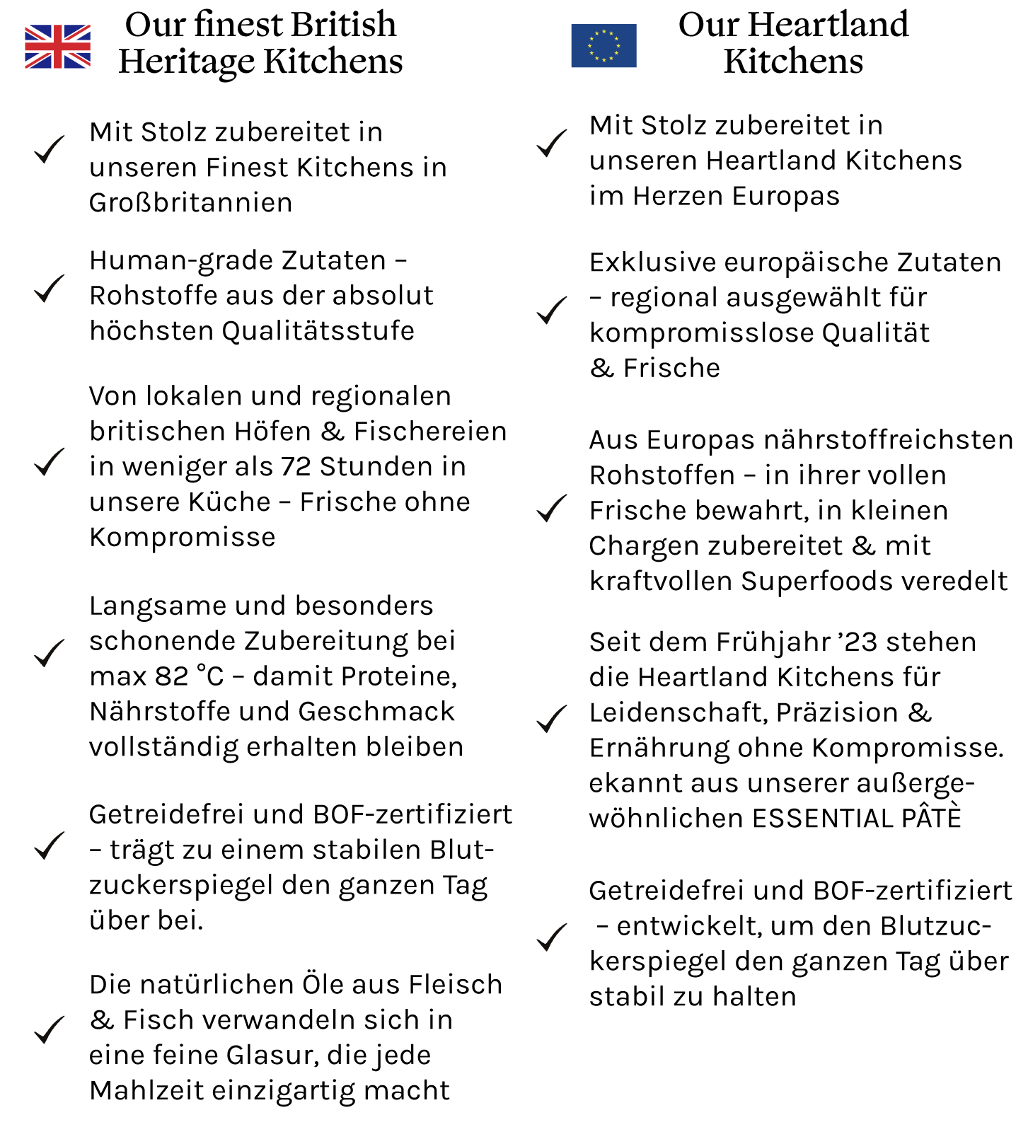 In unserer europäischen Küche bereiten wir unsere Selektion an Ultra-Premium-Mahlzeiten mit sorgfältig ausgesuchten Zutaten aus ganz Europa zu.