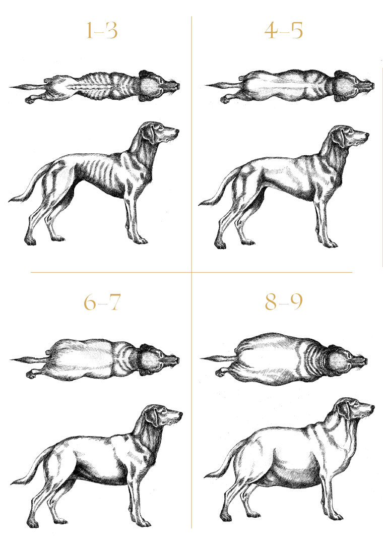 – ein einfacher, praktischer Weg, um zu verstehen, was der Körper Ihres Hundes Ihnen wirklich mitteilt. Mit einer sanften Berührung und einem kurzen Blick können Sie erkennen, ob Ihr Hund zu wenig wiegt, sein Idealgewicht hat oder ein paar Pfunde zu viel mitschleppt.