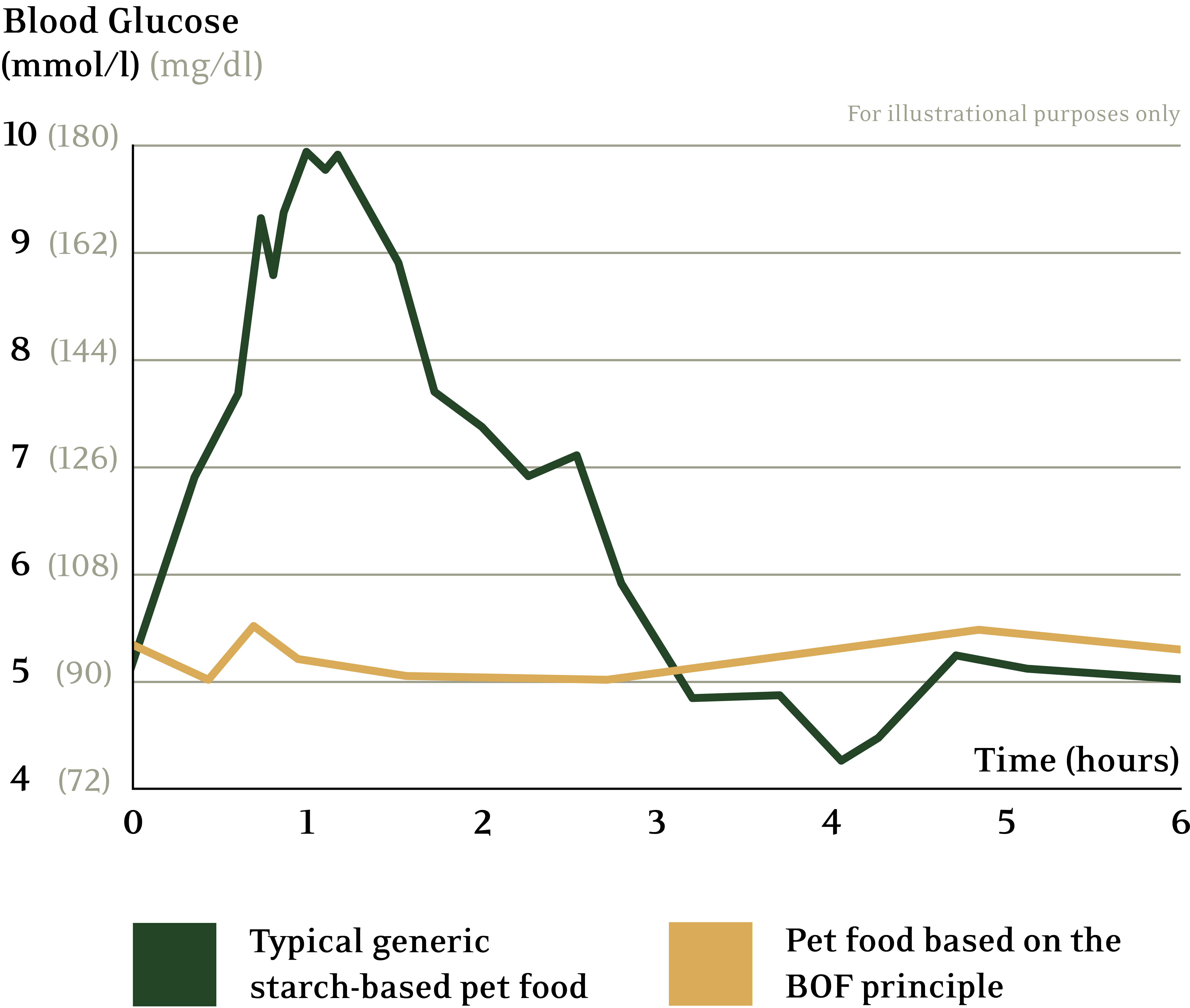 Illustration der Entwicklung des Blutzuckers mit Mahlzeiten auf BOF-Basis vs. gewöhnliches Premium-Hundefutter