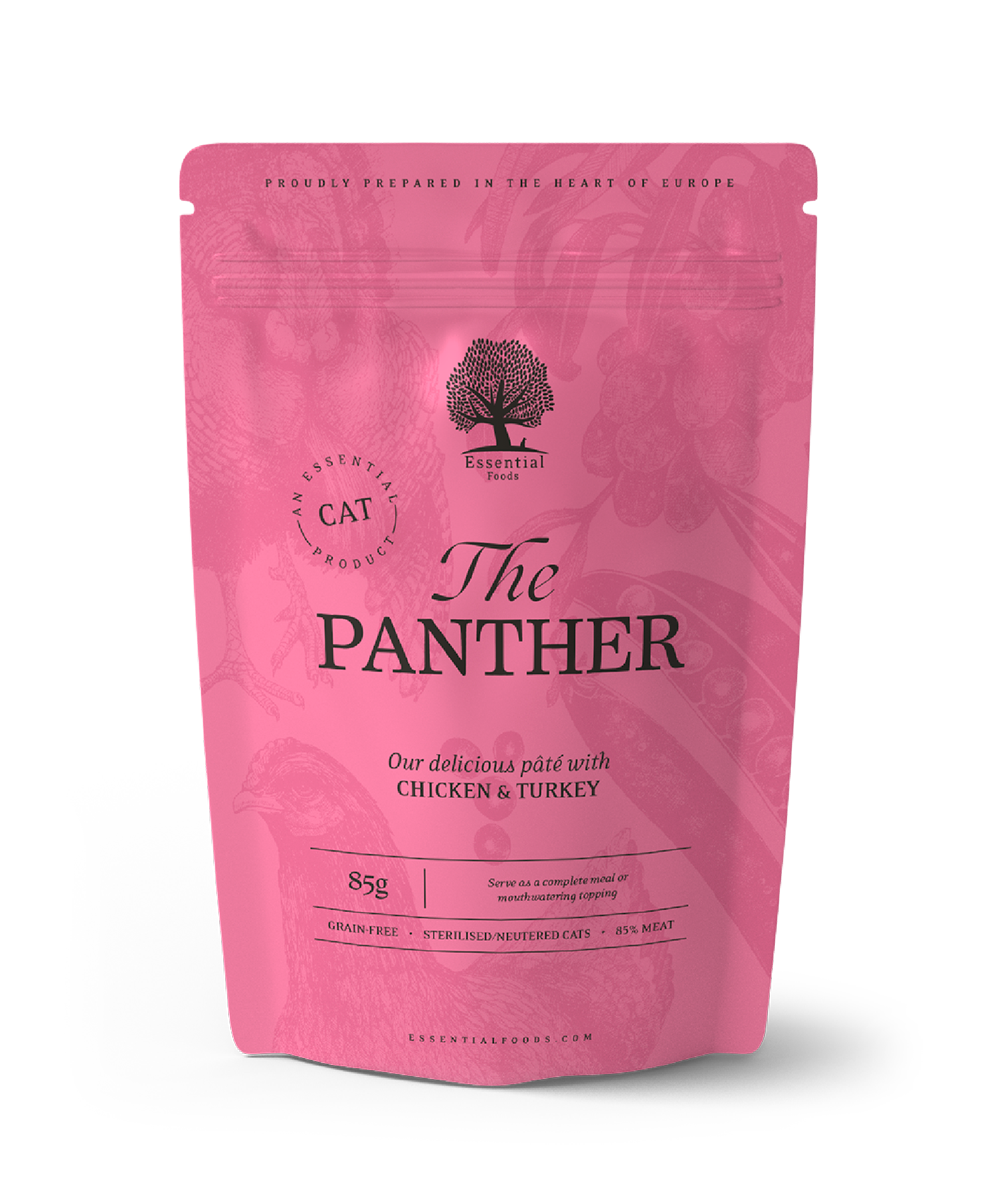 The PANTHER PÂTÉ is our delicious meal with cuts of chicken fillets in a thick gravy with turkey for sterilised/neutered cats and/or cats that lead indoors/inactive lives.